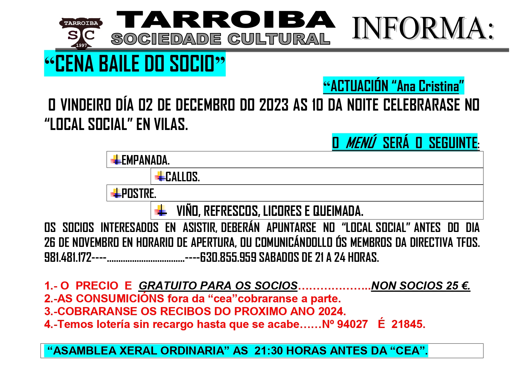 | Dende esta Asociación de Veciños procuramos dalgunha forma facer durante o ano unha serie de xuntanzas extraordinarias de todolos socios. Con este motivo de fondo, facemos de momento seis ceas_baile que enumeramos a continuación. Antroido, San Xosé, San Xoán, unha no Outono, a do socio (gratuita) e a de Fin de Ano. Todas estas ceas_bailes son con música en directo. |
